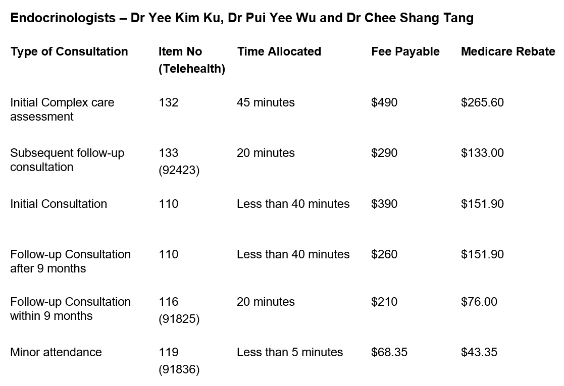 Below is a list of the type of consultation and the related expenses charged by our Endocrinologists, Dr Yee Kim Ku, Dr Pui Yee Wu and Dr Chee Shang Tang in year 2025. Please be aware that the fee will be adjusted yearly to keep up with inflation.