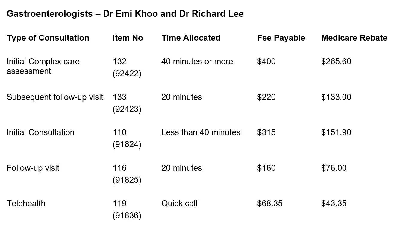 根据澳大利亚联邦医疗保险 - 全民醫保(Medicare Australia)的准则, 诊所必须向所有病患者提供有关的医疗收费。病患可根据相关资料,做出明智并知情的确定。Below is a list of the type of consultation and the related expenses charged by Dr Emi Khoo and Dr Richard Lee in year 2024. Please be aware that the fee will be adjusted yearly to keep up with the inflation.